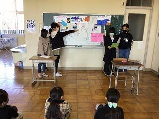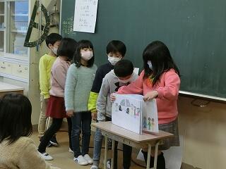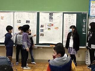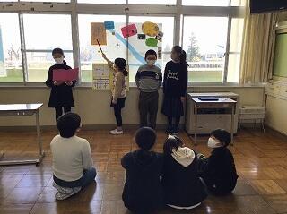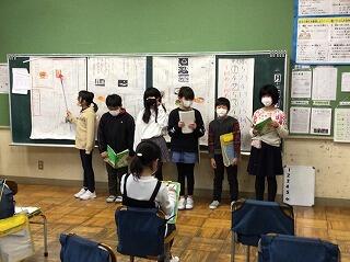 2年生は,生活科「つながる広がるわたしの生活」の町探検で見つけた地域のお店の秘密や魅力について発表をしました。それぞれが見つけたお店の秘密や魅力を新聞や紙芝居,ポスターなどにしてまとめました。新聞にまとめたグループは,文章だけでなく,マンガやクイズなどを取り入れて興味をひく内容にできるように工夫していました。それぞれのグループが,学習してきた成果を発表することができました。