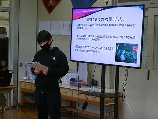 3年生のテーマは「スペシャルフィッシュの秘密を追え」です。気仙沼とつながりの深いサメが,食品や革製品などに加工され,捨てる部位がほとんどないことなどを,ポスターを用いて発表しました。