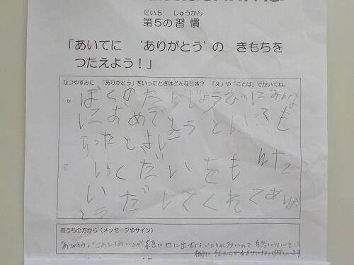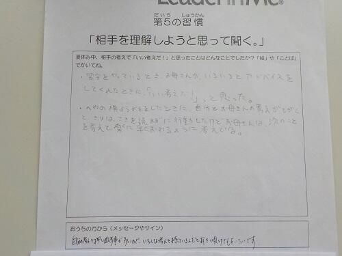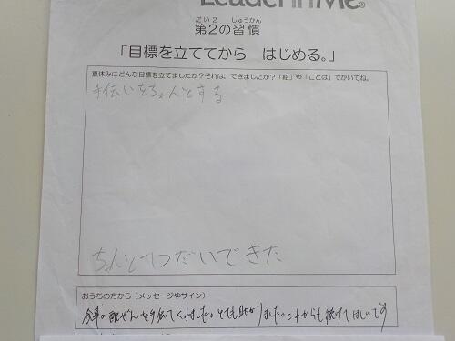 「夏休みdeリーダー・イン・ミー」への御協力ありがとうございました。ワークシートの内容から,どの学年も熱心に取り組んだことが分かりました。また,保護者の方々から温かいコメントをいただき,大変うれしく思いました。本当にありがとうございました。全部紹介したいところですが,今回は,各学年から1つずつ紹介します。