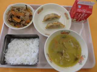 ごはん,やきぎょうざ(2こ),ぶたにくのキムチいため
