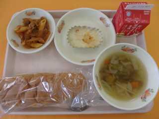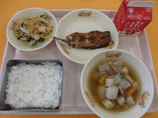ごはん,いわしのオレンジに,とりにくとごぼうのみそいため