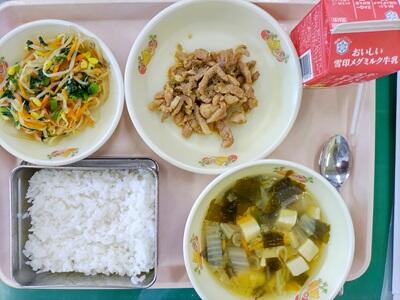 ごはん 牛乳 やきにく(セルフビビンバ) ナムル(セルフビビンバ) わかめスープ