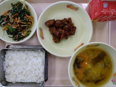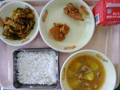ごはん 牛乳 とりにくのからあげ(2こ) すきこんぶいため ピリからみそしる