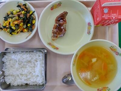 ごはん 牛乳 とりにくのマーマレードやき ほうれんそうとコーンのソテー コンソメスープ