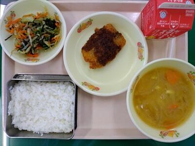 ごはん 牛乳 まぐろフライ レンコンサラダ ちゅうかスープ
