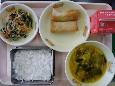 ごはん 牛乳 はるまき もやしとにんじんのしゃきしゃきサラダ たまごいりもちのトックふうスープ