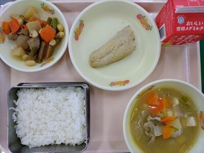 ごはん 牛乳 さわらのさいきょうやき ごもくまめ とんじる