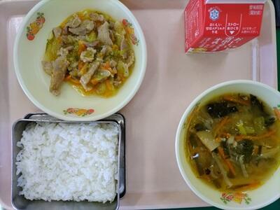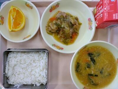 ごはん 牛乳 ホイコーロー たんたんはるさめスープ オレンジ