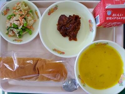 こめこパン 牛乳 かぼちゃがたハンバーグ えだまめとチキンのサラダ パンプキンスープ