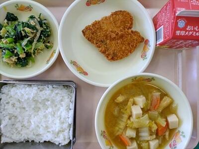 ごはん 牛乳 ハートのコロッケ とうにゅうスープ チョコレートプリン