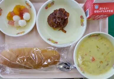 コッペパン 牛乳 ハンバーグデミグラスソースがけ コーンクリームシチュー しらたまフルーツポンチ
