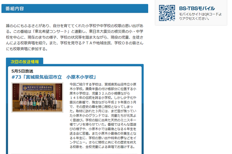 以前連絡していたBS-TBS「校歌を訪ねて」の放送予定が確定しました。
