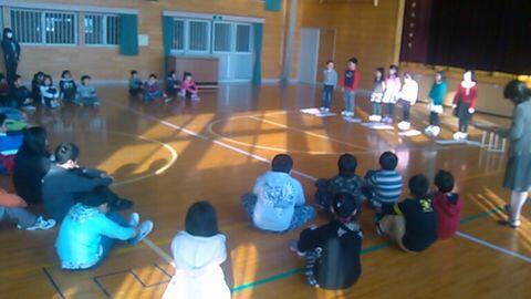 一人ずつの自己紹介に続いて、ことば遊びが次々と発表されました。ジュゲムの暗唱や、上から読んでも下から読んでも同じになる「回文」・・・トマト,イルカはかるい,タイヤをやいた・・・などなど。そして、「じゃんけん遊び」。これは、遊び方を説明してから学年を決めて対戦しました。発表の声がしっかり聞こえてきて、とても楽しい時間でした。