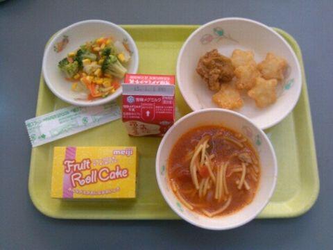 今日の献立:トマススープスパゲッティ 鶏の香味揚げ フライドポテト ブロッコリーサラダ セレクトケーキ