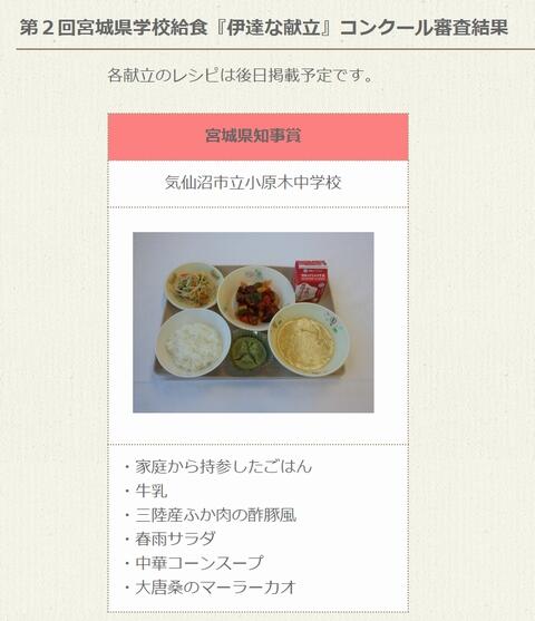小原木中学校が、第2回宮城県学校給食『伊達な献立』コンクールで「宮城県知事賞」を受賞されました!おめでとうございます!