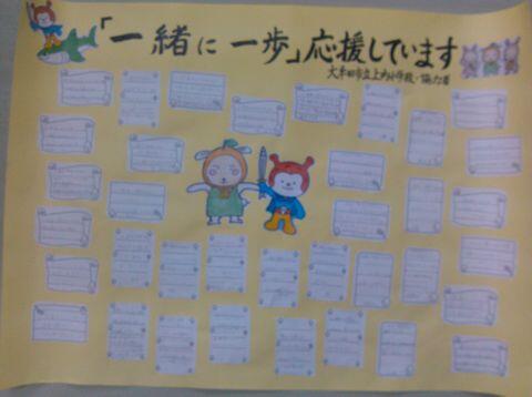 今日、小包の郵便物が学校に届きました。中には、模造紙大の紙にていねいに貼られたメッセージでした。「まだまだ大変なことが多いと思いますが、みんなで協力してがんばってください。」などの応援メッセージです。大牟田市立上内小学校の皆さん、ありがとうございました!
