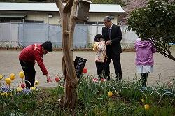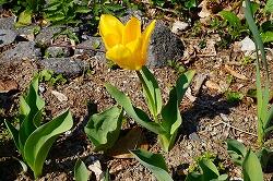 校舎裏花壇のチューリップが一輪咲きました。