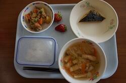 今日の給食は,ほっけの塩焼き,肉じゃが,キャベツと油揚のみそ汁,いちごでした。
