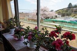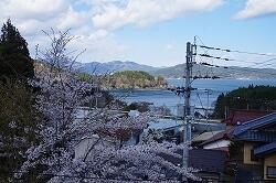 2階の廊下から見える,桜越しの広田湾の景色です。