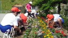 マリーゴールド,サルビアなどたくさんの花苗をみんなで協力して花壇に植えました。