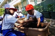 みんなでゴーヤーを植えて教室前に設置した後,体育館でゴーヤーダンスを楽しく踊りました。