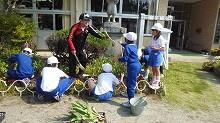 今朝は全校でチューリップの球根採取を行いました。春先にきれいな花を咲かせましたが,その役割を終えました。大きな球根がたくさん取れました。