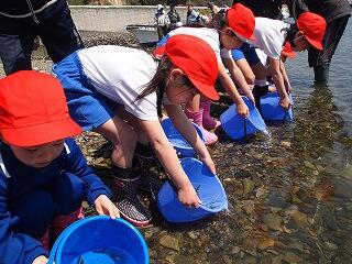 大きくなって海に戻ってくることを願って放流しました。