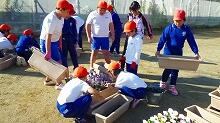 業前の時間,全校でプランターにストック,ビオラなどの花の苗を植えました。