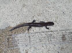 今朝,学校の玄関付近にサンショウウオが…。4年生児童が見つけました。