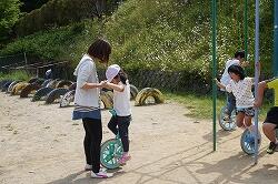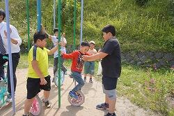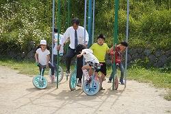 上学年が下学年に乗り方を教えてあげています。一日であっという間に乗れる距離が増える子もいます。先生方も密かに挑戦中です。