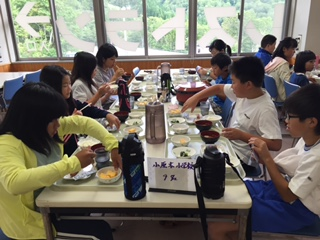 みんな元気です。朝食もしっかり食べて,活動の準備は万端です。