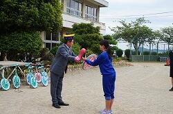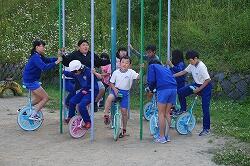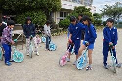 贈呈式の後の休み時間と放課後に,子どもたちは早速新しい一輪車に挑戦していました。
