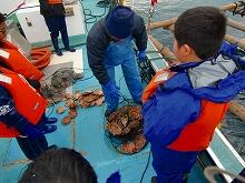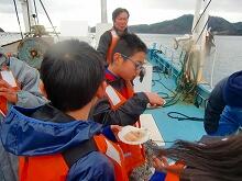 その後,船に乗ってホタテ漁の様子も見学しました。船上ではホタテをごちそうになりました。