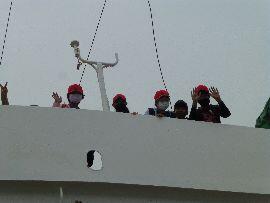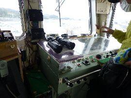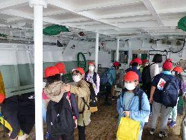 ◆次は,北かつ漁船の船内見学です。ちょうど1年航海を終えたばかりの漁船を見学させていただきました。案内していただいた船内すべてが初めて見るもので,わくわくしてしまいました。また,船内では,北かつ様のご厚意でマグロづけすしをいただきました。