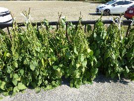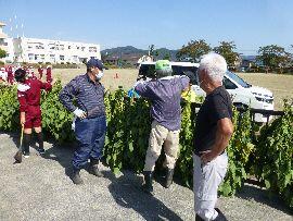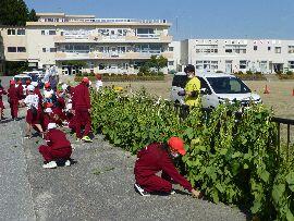 ◆5年生総合的な学習の時間に、毎年畑をお借りして農作物を育てているのですが、今日は「枝豆」を刈り取っていただいたものを学校にもってきていただき、フェンスに枝ごとかける作業を行いました。