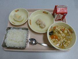 ◆今日の給食は,えびしゅうまい(2個),とうふの中華煮,梨(なし),ごはん,牛乳の計 620kcalでした。
