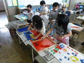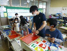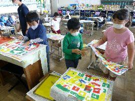◆今日は2年生の図工の様子です。またまた,好きな形に型をくりぬいて,画用紙にペタペタと形を印刷していきます。一人一人がオリジナルのデザインを作っていました。