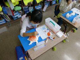 ◆今日は1年生の図工の授業におじゃましました。授業のめあては「紙ねんどに色をぬって,すてきにしあげよう。」です。自分の好きな色,また,2つの色をまぜて気に入った色にして紙ねんどにぬっていきました。絵の具のうすめ具合の調節や筆で色を塗るときの真剣なまなざしが印象的でした。
