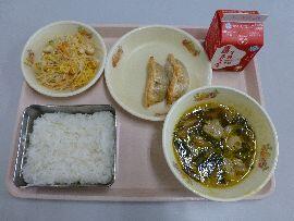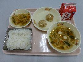 ◆今日の給食のメニューは,ショーロンポー(2個),チャプチェ(春雨を使った韓国料理),鶏肉とだいこんの中華スープ,ごはん,牛乳でした。