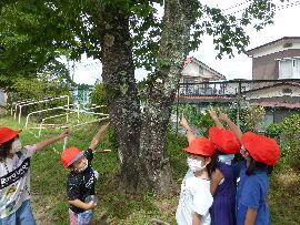 ◆1年生の後をついて行くと「校長先生,セミ取って下さい!」との声。手を伸ばしてもぎりぎりのところにセミがいたのですが,児童がすぐに帽子を貸してくれて,虫かごに入れることができました。よく観察したら自然に帰してあげて下さいね。