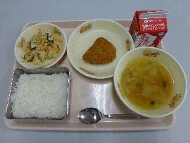 ◆今日の給食のメニューは,かぼちゃコロッケ,キャベツとチキンのサラダ,じゃがもちスープ(かみかみメニューです),ごはん,牛乳でした。