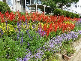 ◆太陽の光があたると,学校花壇はいっそうあざやかに映(は)えます。これまで学年ごとに草取をしたり,休み時間には緑化委員会のみなさんがじょうろで水をたっぷりとあげたり,みんなで花壇のお世話をしてきました。