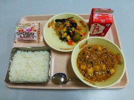 ◆今日の給食のメニューは,海藻サラダ,マーボー豆腐,さつまいもと栗のタルト,ごはん,牛乳で,計 718kcal でした。