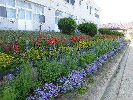 ◆夏休み中は用務員の村上さんや先生方が,花壇の花のお世話をしています。色とりどりの花がきれいに咲いています。