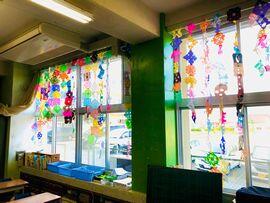 ◆これも1年生,はさみの使い方を学んで,いろいろな模様ができるよう折り紙にはさみを入れました。そして,きれいにつなげ,窓に飾りました。ステンドグラスのようですね!