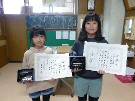 ◆音楽朝会の前には表彰を行いました。第39回マイヤ書道展(主催:株式会社マイヤ,後援:三陸書人社)で特選賞に選ばれた,6年1組の西城侑愛さんと6年2組の千葉渉夢さんです。多くの児童が,夏休みの課題としてこの書道展に応募してくれました。九条小の児童は,夏休みの課題でいろいろなものに応募しています。挑戦してみる姿勢がとてもすばらしいと思います。