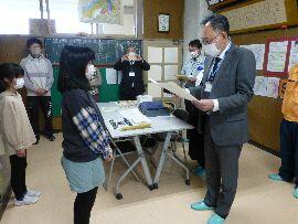 ◆今日は,宮城県気仙沼土木事務所の鈴木所長様が本校を訪れ,臼井さんと西城さんに感謝状が贈られました。さらに工事を請け負ったライブディックさんからは,2人に記念品としては橋めい板のミニレプリカが贈られました。みなさんも神山川橋を渡る時に,ぜひご覧下さい!