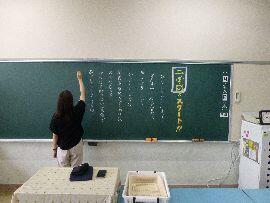 ◆いよいよ明日から2学期が始まります。菊先生は,子供たちを迎える最後の準備です。そうです。明日の朝,子供たちが教室に入った時に,迎えるメッセージを,菊先生は一生懸命考えながら,心を込めて書いていました。(後でもう度教室に行ってみたら,黒板の左側には「ドラえもん」が描いてありました。
