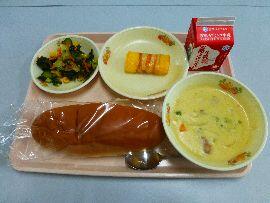 ◆今日の給食のメニューは,たまごのベーコン巻き,ほうれんそうのサラダ,白花豆のミルクスープ,ソフトパン,牛乳の計 733kcalでした。