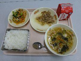 ◆今日の給食は,やきにく(セルフビビンバ),ナムル(セルフビビンバ・かみかみメニュー),えびとわかめのスープ,ごはん,牛乳の計 618kcalでした。